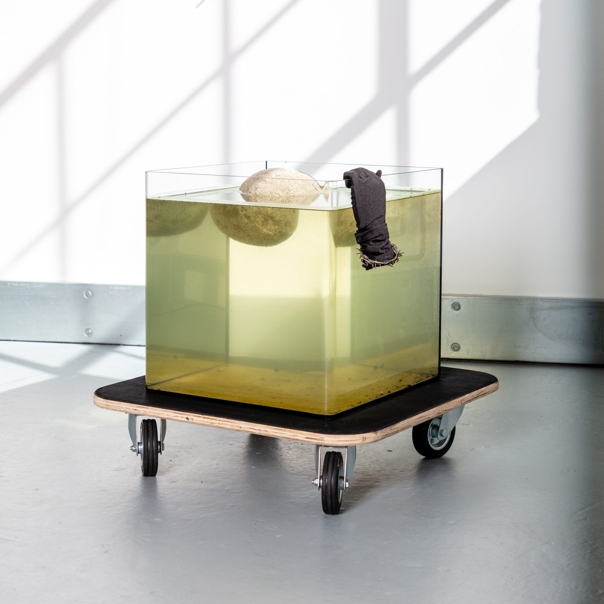 Pumice stone, glass container, river water, wooden hand, fabric, metal, skate