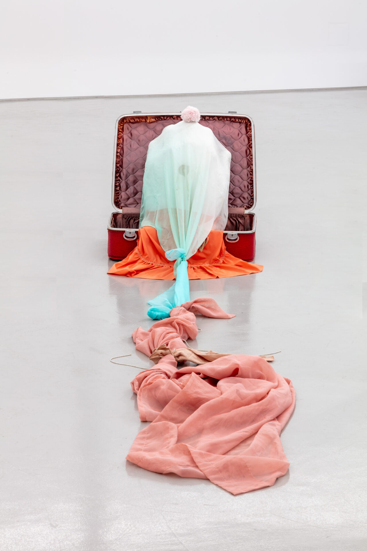 Nesting suitcase, polystyrene, fabric, paint, pom-pom, rope, string
