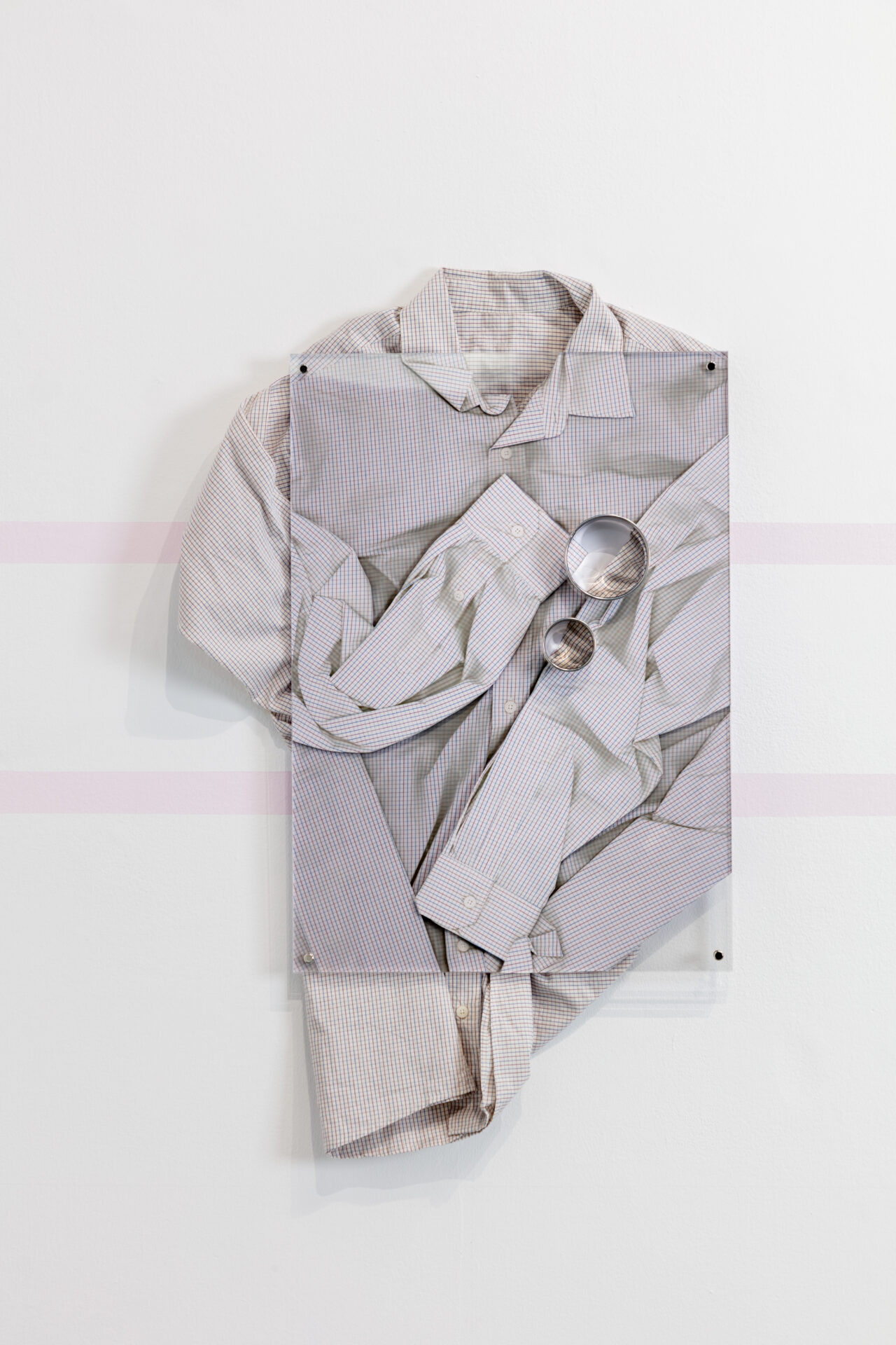 Clear acrylic, stainless steel cookie cutters, bookbinding screws, giclee print on archival paper, shirt