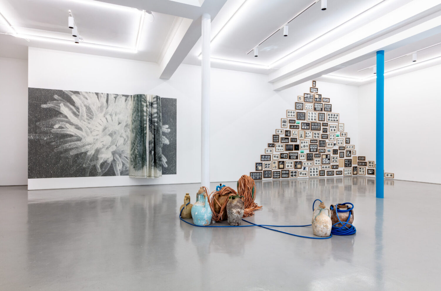 The passing of time is also the substance of a large piece displaying an anemone (Anemones, 2016/2026), a creature that, despite its appearance, is not a flower but an animal. Feriancová has recurrently turned her attention to maritime life, fascinated by peculiarities of species that can live long, self-regenerate and defy time – in addition to the anemone, this includes, for instance, poriferans and hydras. Noteworthy, all of these creatures are named with Greek words and, in some cases, after Greek myths, adding to this connection. A group of ceramic vases that are displayed on the floor (Untitled, 2014/2026) allude to such aquatic creatures in their form, while they dialogue with the artist’s fascination with archaeology. Furthering her explorations with water is Formants of Water 2026 (in collaboration with Stroon) (2026), an aquarium filled with tap water, a filter that gently waves the liquid, as well as a special microphone that records the sounds created by the waves – which are then amplified and played over the gallery space. This work nods to a previous piece Feriancová created with an aquarium, paying homage to Ophelia, Hamlet’s tragic heroine. Noteworthy, Ophelia’s death has many parallels with the passing of Echo: both muses died prematurely, with a broken heart, and water played an essential role in both deaths – by acting as a mirror for Narcissus, and by drowning Ophelia. Hans Christian Andersen’s The Little Mermaid’s (1837) original fate – not the Disney sweetened version – also resonates here tragically.