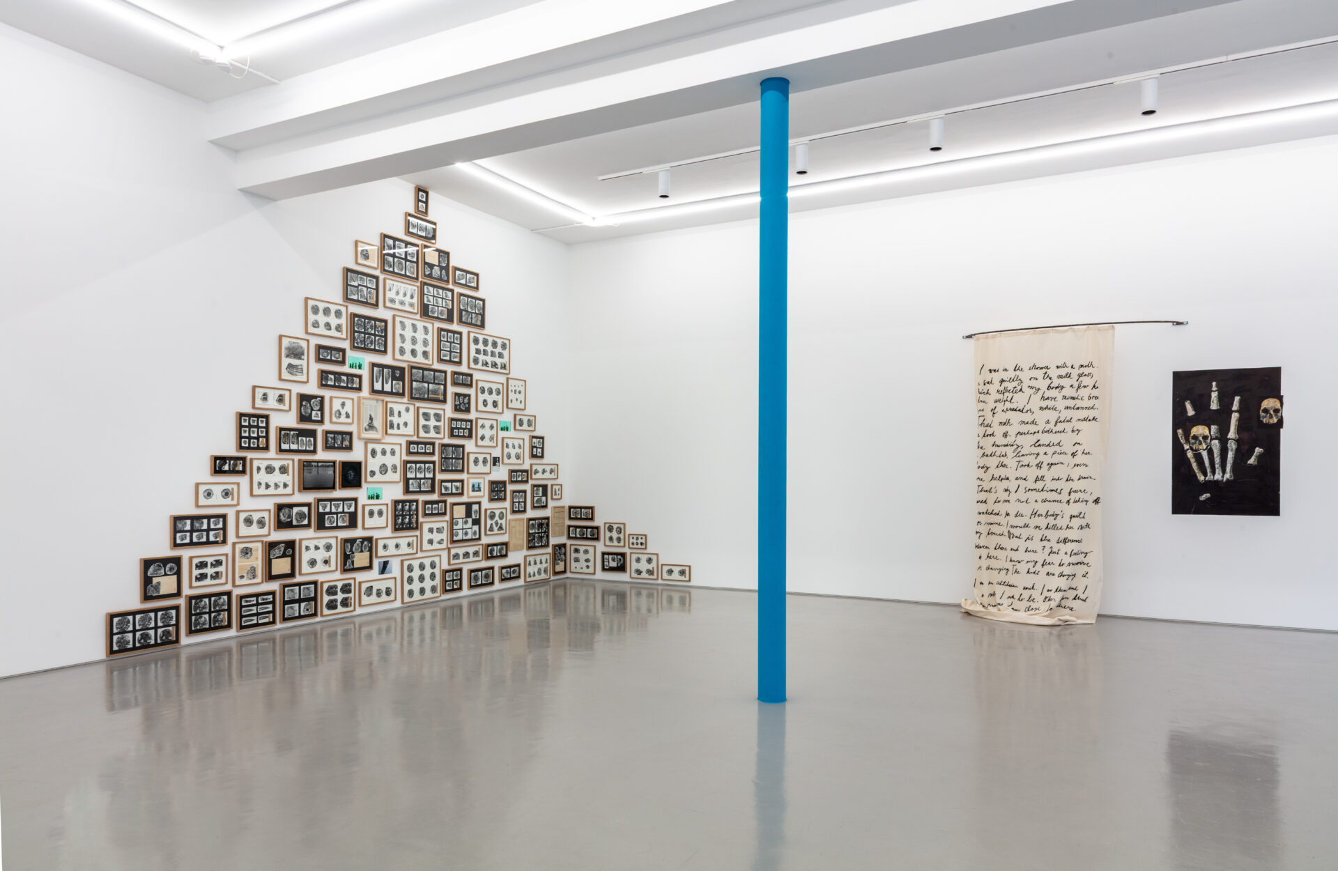 Such amalgamation of references sets the tone of this exhibition, introducing the very circumstances from where Feriancová’s practice sings: erudite and multifaceted at the core. As in an Agatha Christie novel, nothing in the artist’s work is arbitrary or devoid of meaning. In her vocabulary, elements exist on their own, as well as parts of a well orchestrated narrative – or rather narratives – that constitute her body of work. The notion of archaeology is key, and beautifully represented by an assortment of fossils and, indeed, bones. These once organic matters fascinate Feriancová for they are indexes of time, reminding us of the inevitable decadence of all living things – good and bad, pretty and ugly, great and small. They are present in works such as Echo’s Bones 2026 (2026), an assortment of marble bones that she imagined as belonging to the nymph Echo. Also, in Untitled (Hand/Skulls) (2015/2026), the eerie wallpaper of half a hand of bones with photos of skulls placed atop, as well as Found and Given 2015/Fossils 2026 (2015/2026), a pyramid-shaped collection of photographs and objects. The bulk of the images that constitute the latter came to her via a friend, who was the last person to work on a photo-developing studio in Budapest, where these images – of fossils and other organic matter from some ancient forest – were forgotten. Feriancová added some extra imagery to the composition, where the subject of water is always nodded at – scenes in the aquarium, photos of Venice, pieces of The Little Mermaid – charging the work with new resonances whilst disrupting the simple displacement logic of the readymade. As the artist would put it, by mixing found and made elements together, she becomes both the audience and the creator of the work.