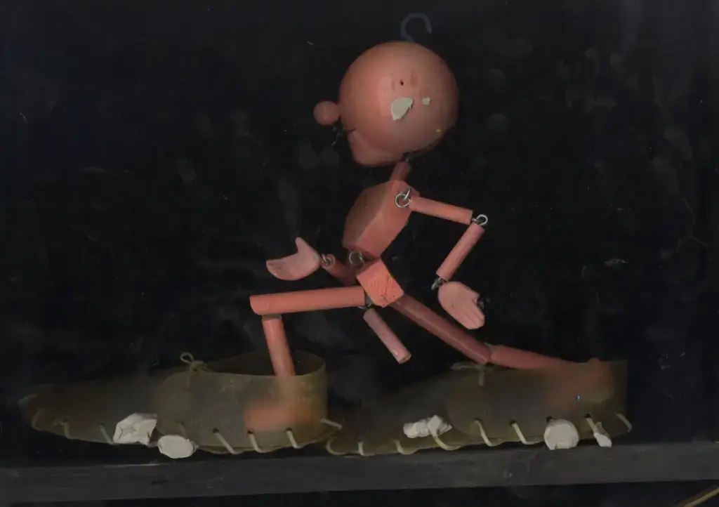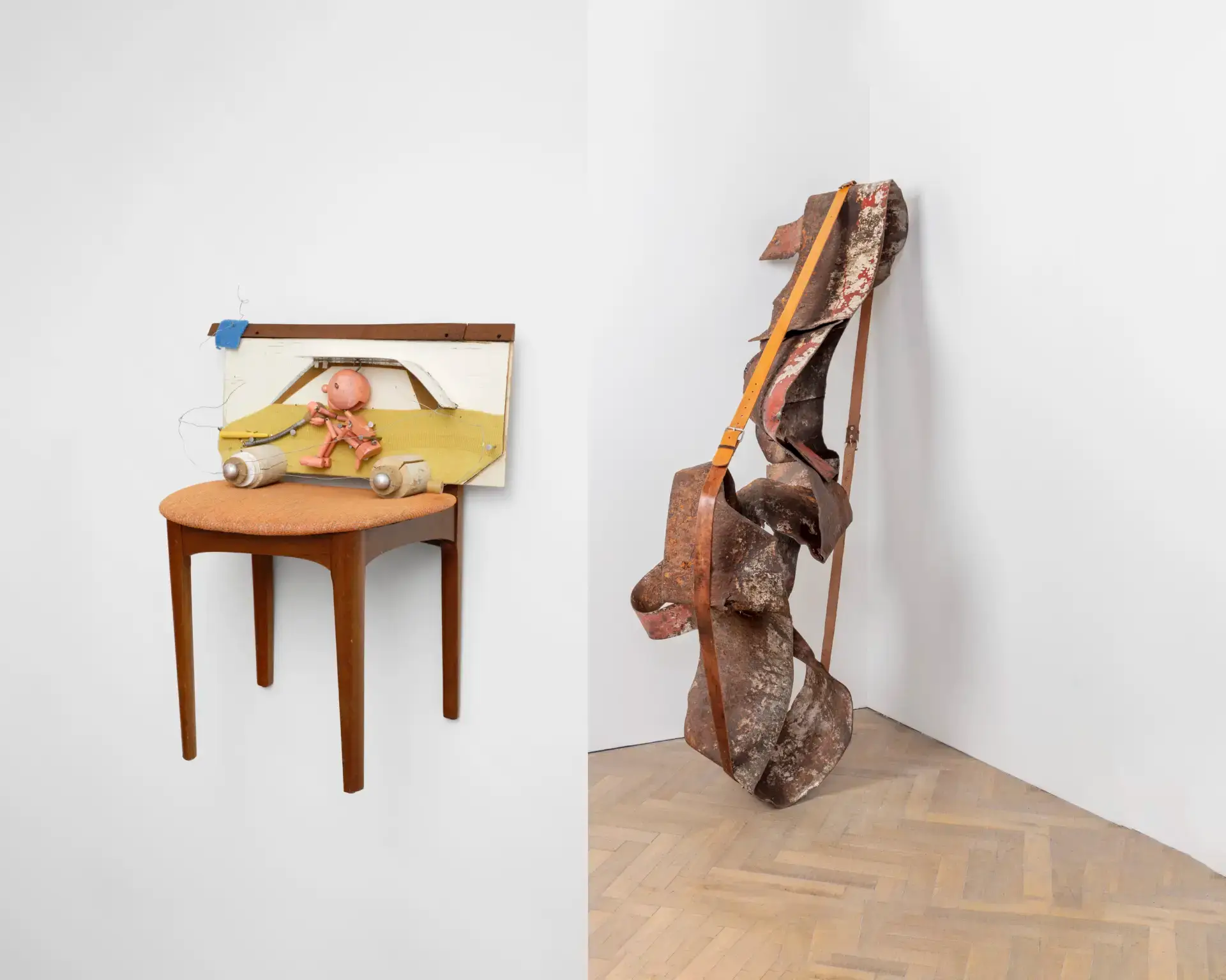 Such dialogue was largely inspired by the transportability of the Exiles, to which Griffiths responded with sculptures that, in common, share a travel case. In his This is Not an Exit (2025) series, open briefcases appear on top of leatherette sofas and armchairs – one pink, one white and one blue – placed atop skirted wooden trestles, thus acquiring kitsch and stage qualities. Inside each of them is a pink puppet, acting as conductor of these magical assemblages, alongside an assortment of office equipment one might expect to find in a briefcase. The absurdity and playfulness of these works reflect one driving force behind Griffiths’ practice, namely his interest in how ‘objects, ideas, and their histories accumulate to create frictions and contradictions’. The fact that the title of this series quotes verbatim the end of the cult novel American Psycho (Bret Easton Ellis, 1991) adds a dramatic tone, evoking a world in which lives are constantly performed. This is Not an Exit pertains to a larger body of work titled No No to Knock-Knocks (2018 – ongoing), a diverse umbrella that is bound together by the presence of this miniature, naked male character.