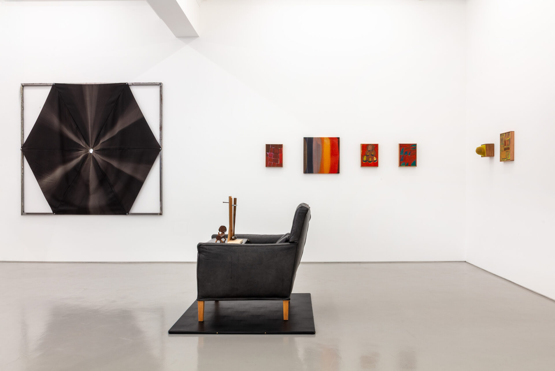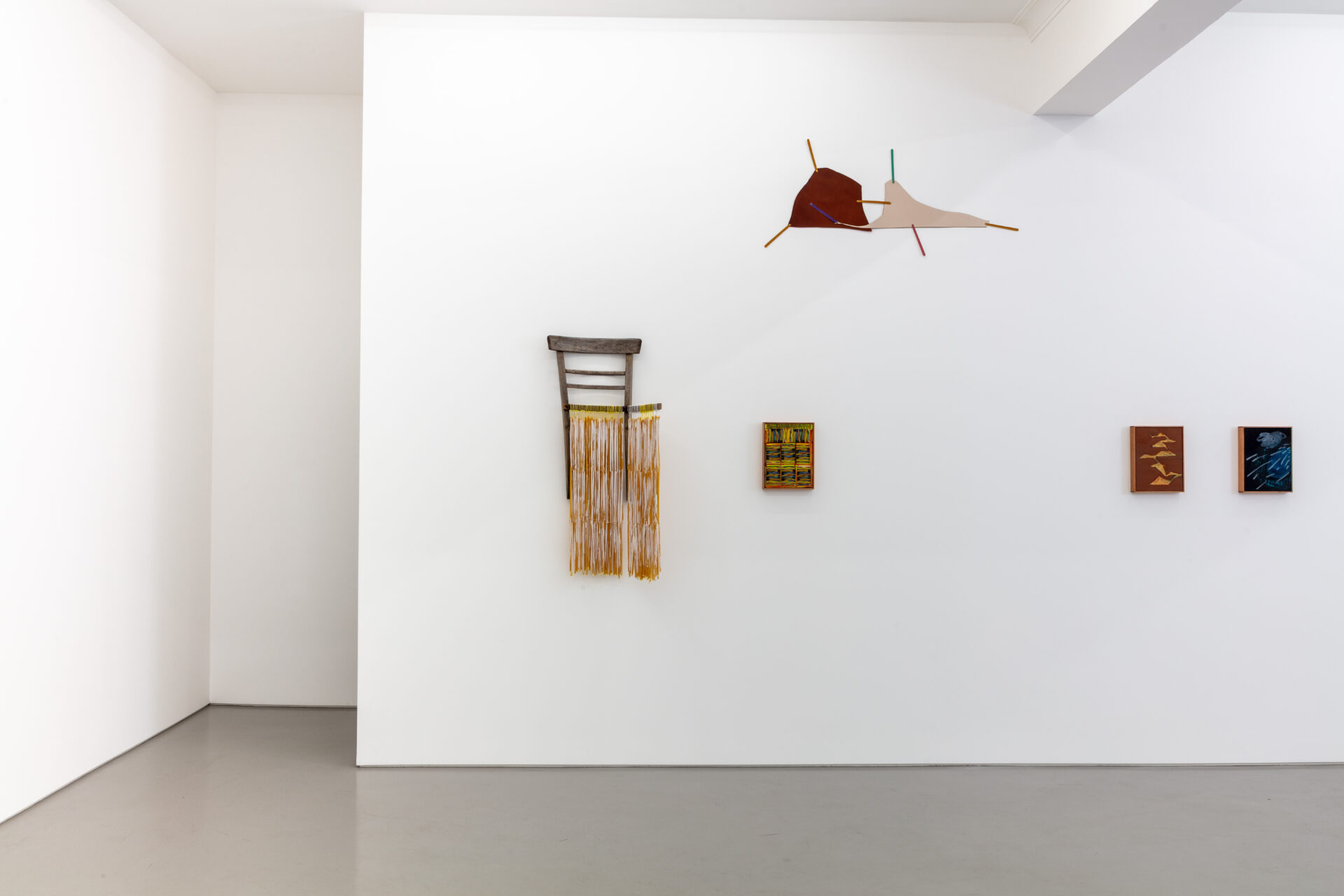 The briefcases make a final iteration in Home with a Man, appearing locked in Good Boy Ben (2025). Here, two cases are diligently guarded by Ben, a vintage-looking wooden dog that sits on top of them, which in turn are on top of a black leather armchair. Griffiths’ use of cases, objects he signifies as both ‘a landscape and a context’, punctuates the show by repetition, offering a sense of continuity to an otherwise heterogeneous environment. Alexandre da Cunha’s Exile gouaches further emphasise this sense of flow by being present on every wall. There are sixteen gouaches spread around the gallery, showcasing different degrees of figuration; unusual to the artist’s vocabulary, the human body is present in one of these gouaches, Exile (Catwalk) (2025), as if nodding to Griffiths’ puppet. Yet the gouache that titles the show is absent from the walls, available only as a poster to take away – a small, portable fragment of Home with a Man.