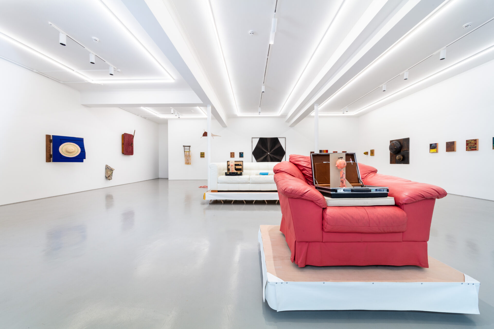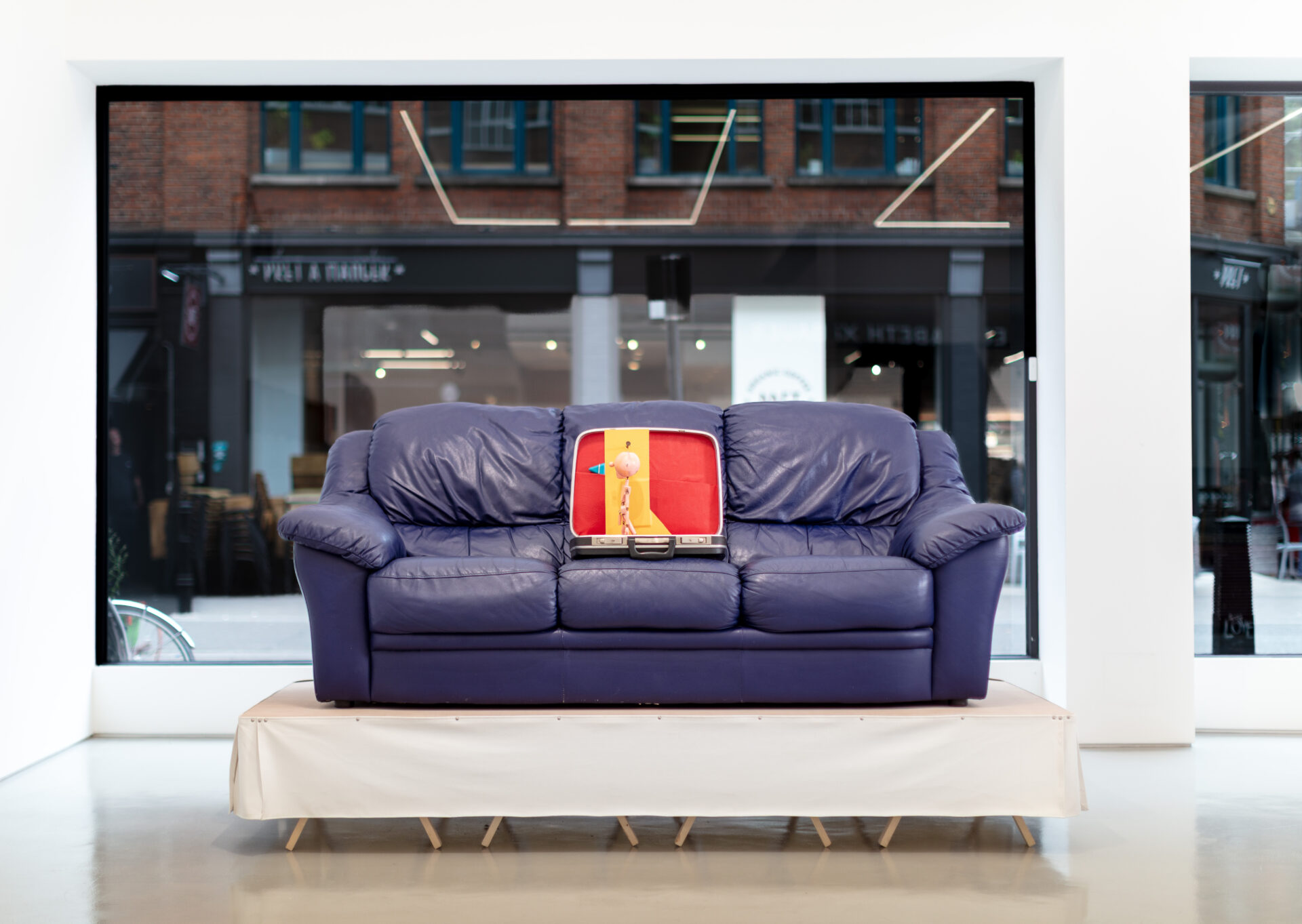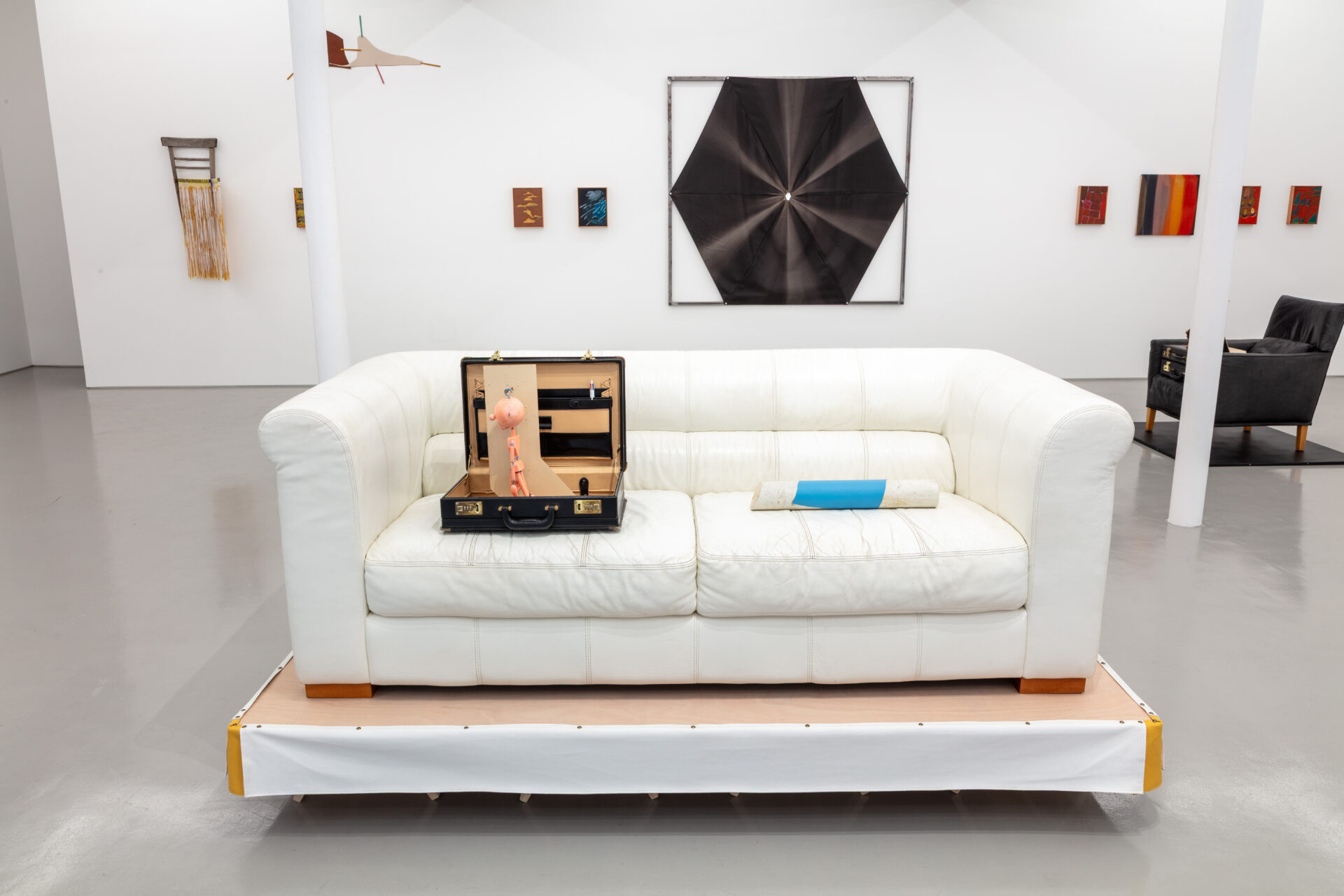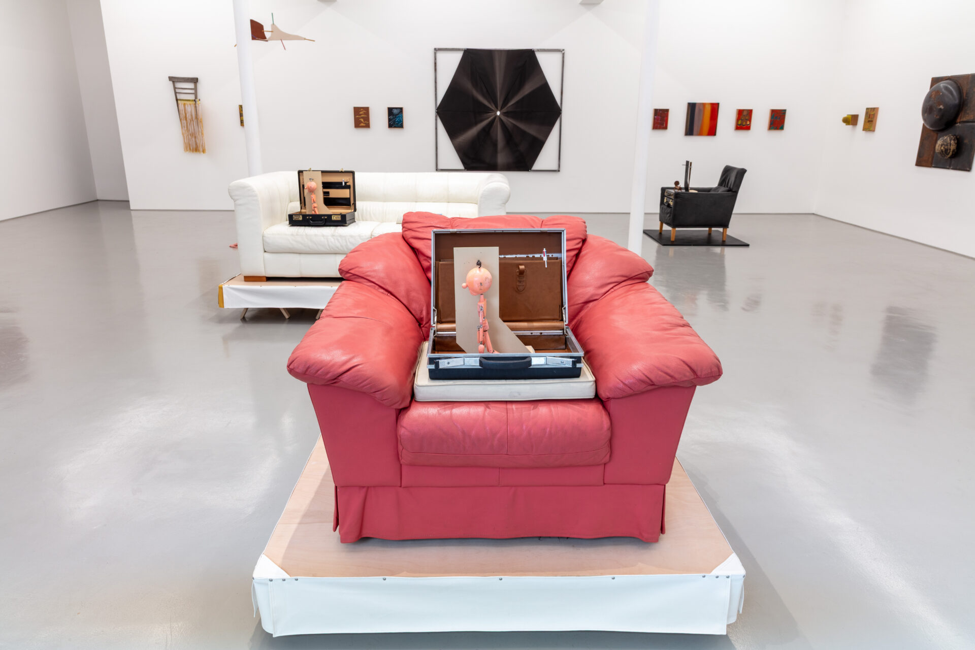 Such dialogue was largely inspired by the transportability of the Exiles, to which Griffiths responded with sculptures that, in common, share a travel case. In his This is Not an Exit (2025) series, open briefcases appear on top of leatherette sofas and armchairs – one pink, one white and one blue – placed atop skirted wooden trestles, thus acquiring kitsch and stage qualities. Inside each of them is a pink puppet, acting as conductor of these magical assemblages, alongside an assortment of office equipment one might expect to find in a briefcase. The absurdity and playfulness of these works reflect one driving force behind Griffiths’ practice, namely his interest in how ‘objects, ideas, and their histories accumulate to create frictions and contradictions’. The fact that the title of this series quotes verbatim the end of the cult novel American Psycho (Bret Easton Ellis, 1991) adds a dramatic tone, evoking a world in which lives are constantly performed. This is Not an Exit pertains to a larger body of work titled No No to Knock-Knocks (2018 – ongoing), a diverse umbrella that is bound together by the presence of this miniature, naked male character.