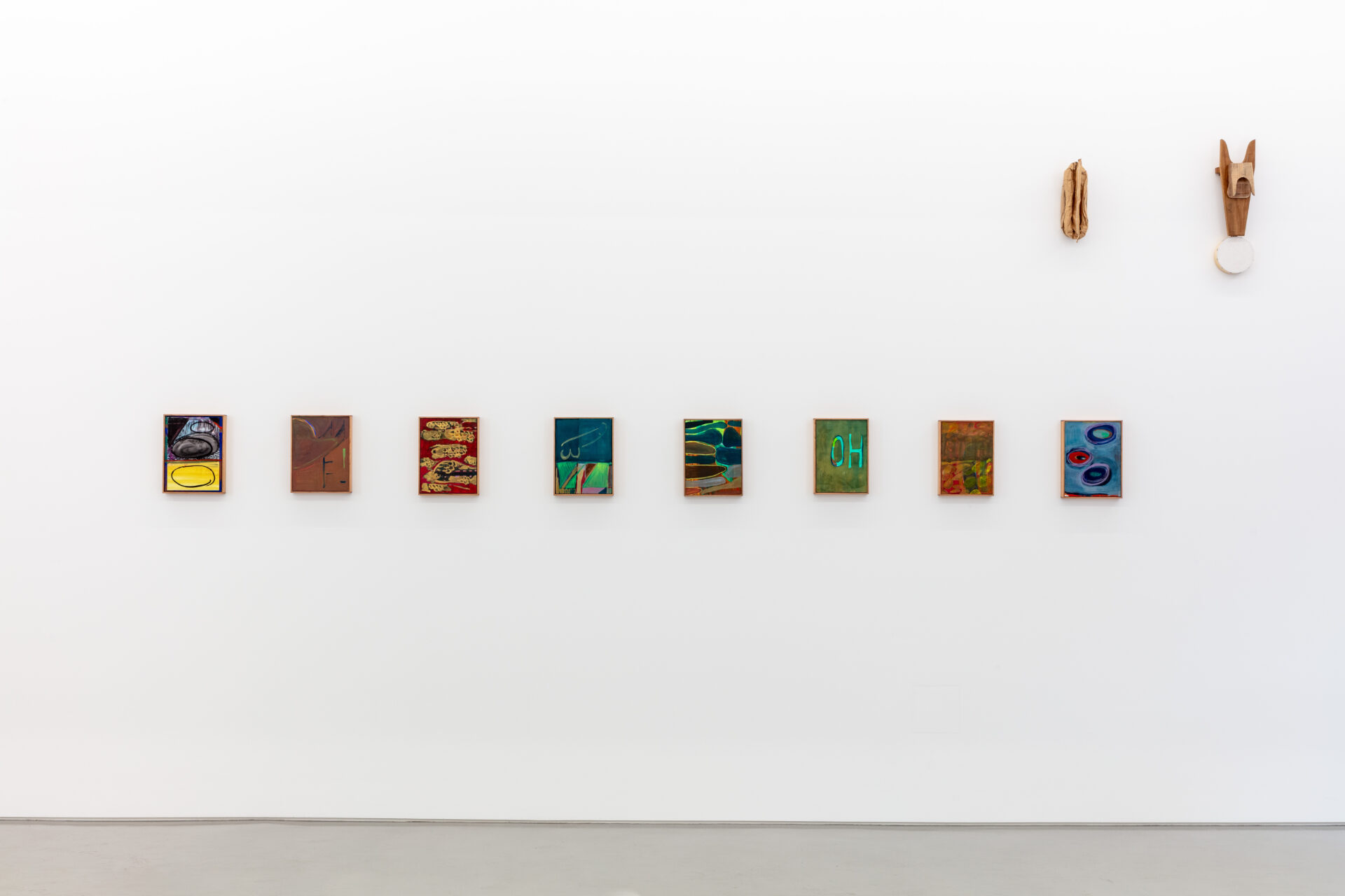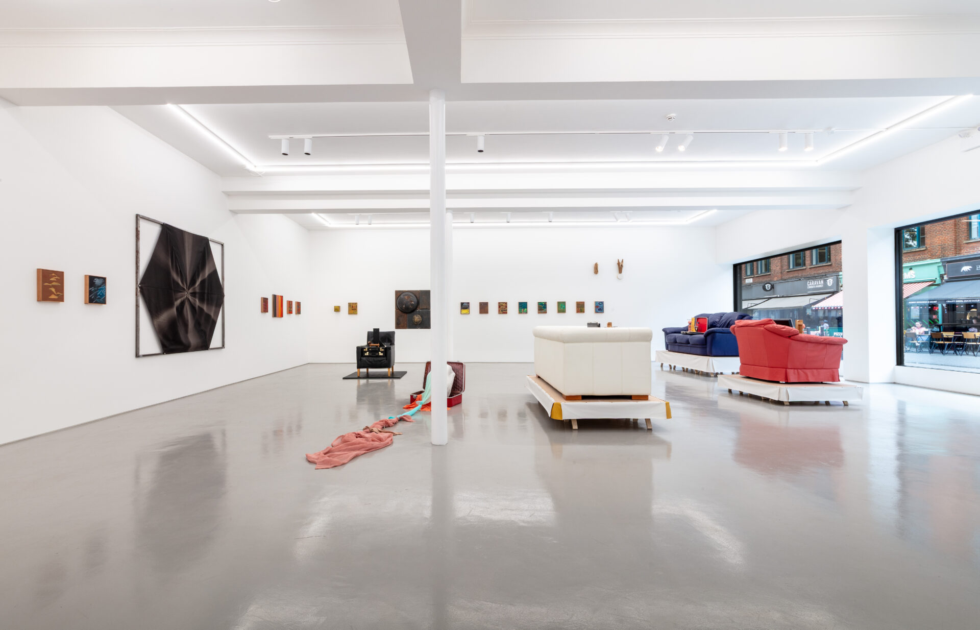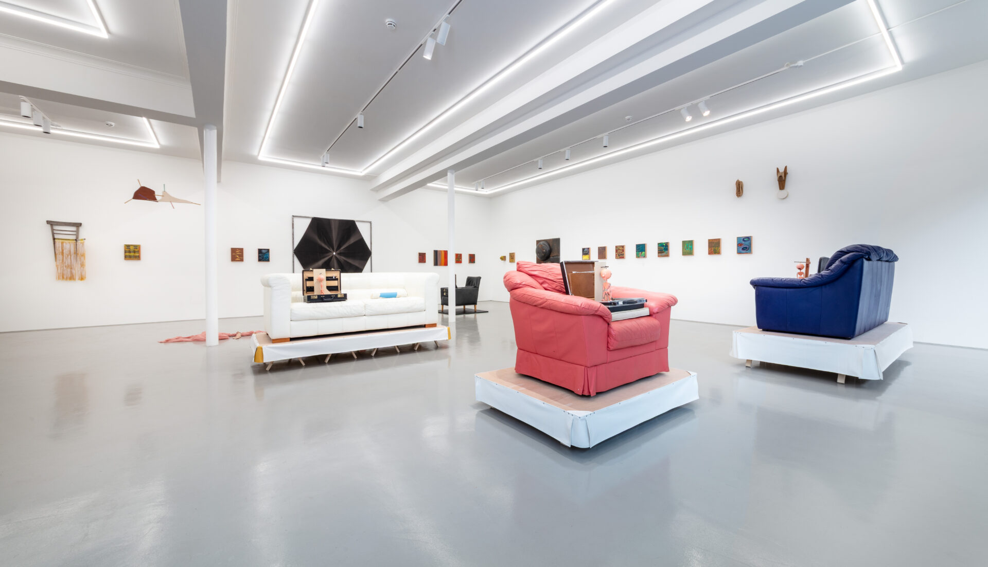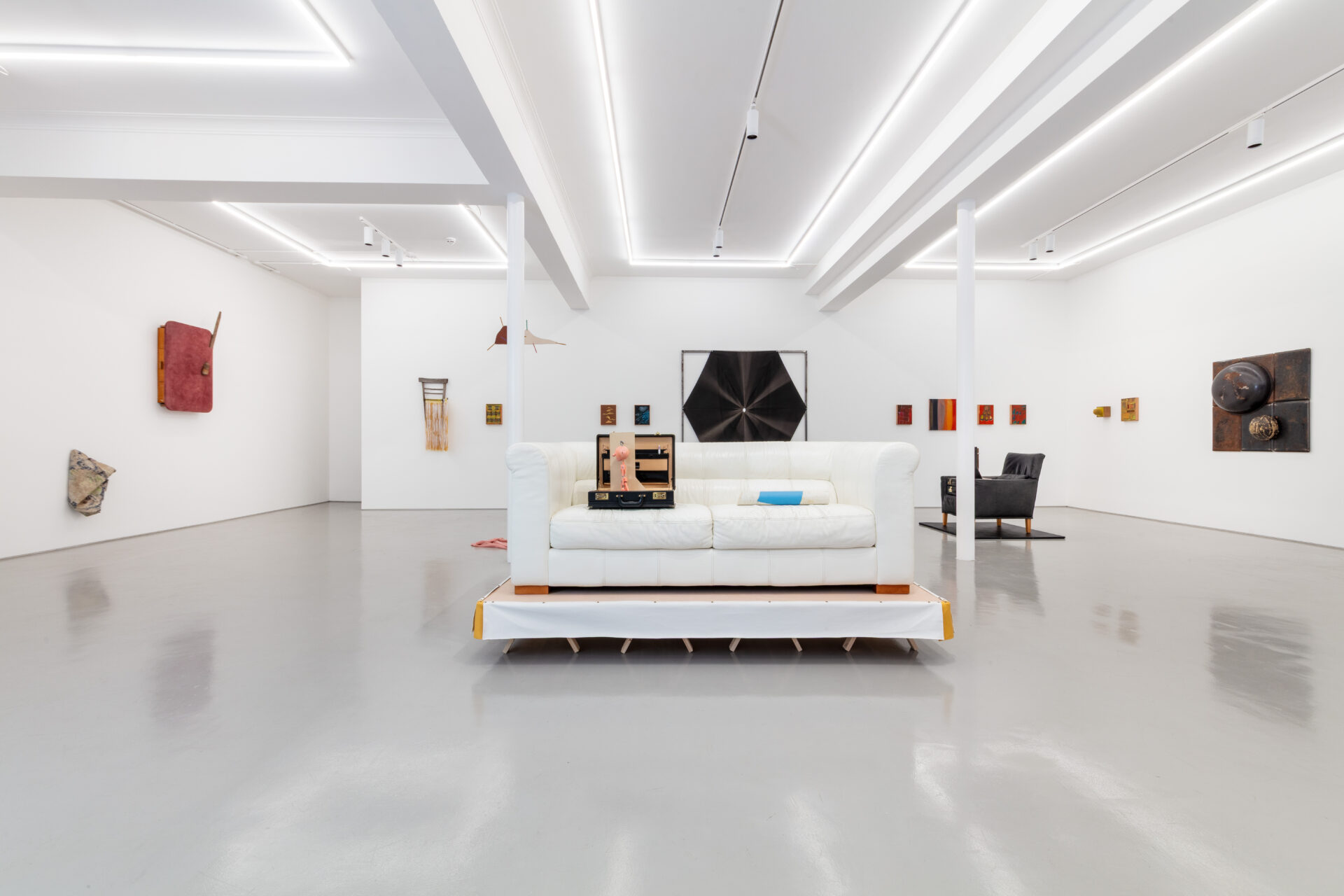 Such dialogue was largely inspired by the transportability of the Exiles, to which Griffiths responded with sculptures that, in common, share a travel case. In his This is Not an Exit (2025) series, open briefcases appear on top of leatherette sofas and armchairs – one pink, one white and one blue – placed atop skirted wooden trestles, thus acquiring kitsch and stage qualities. Inside each of them is a pink puppet, acting as conductor of these magical assemblages, alongside an assortment of office equipment one might expect to find in a briefcase. The absurdity and playfulness of these works reflect one driving force behind Griffiths’ practice, namely his interest in how ‘objects, ideas, and their histories accumulate to create frictions and contradictions’. The fact that the title of this series quotes verbatim the end of the cult novel American Psycho (Bret Easton Ellis, 1991) adds a dramatic tone, evoking a world in which lives are constantly performed. This is Not an Exit pertains to a larger body of work titled No No to Knock-Knocks (2018 – ongoing), a diverse umbrella that is bound together by the presence of this miniature, naked male character.